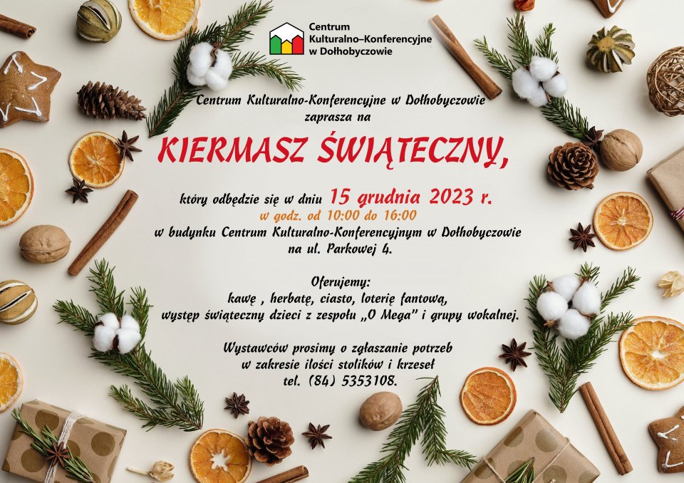 Centrum Kulturalno-Konferencyjne w Dołhobyczowie zaprasza na KIERMASZ ŚWIĄTECZNY, który odbędzie się w dniu 15 grudnia 2023 r. w godzinach od 10:00 do 16:00 w budynku Centrum Kulturalno-Konferencyjnym w Dołhobyczowie na ul. Parkowej 4.